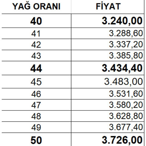 ham yağ oranına göre yapılan alımlarda % 41 ve üzeri yağ oranı çıkan ürünler yüksek yağ oranlı ürün olarak değerlendirilecek olup, her bir yüzde puan artışı için %40 standart yağ oranlı ürün fiyatına % 1,5 oranında prim uygulanacaktır.